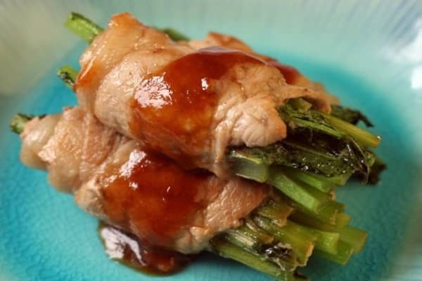 1.小松菜は5cm長さに切り、豚肉にのせて巻く。