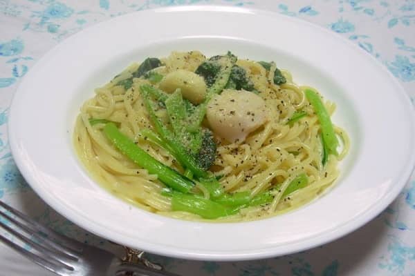 1.パスタは塩湯でアルデンテに茹で、途中で2cmに切った小松菜を加える。