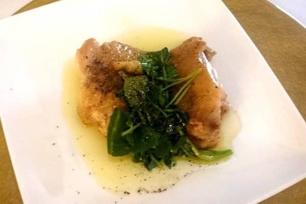 1.鶏もも肉に塩、こしょうし、小麦粉を付けて皮側からオリーブ油で中火で焼く。