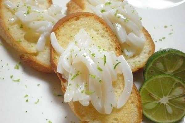 ①フランスパンは5mm厚さに切ってトースターで焼き色をつけ、にんにくの半量を半分に切ってこすりつける。