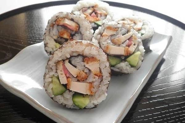 3.巻きすに海苔1枚をのせて酢飯の残りを広げ、2を中央に置き、両脇に胡瓜を縦十字に切ったものをのせる。