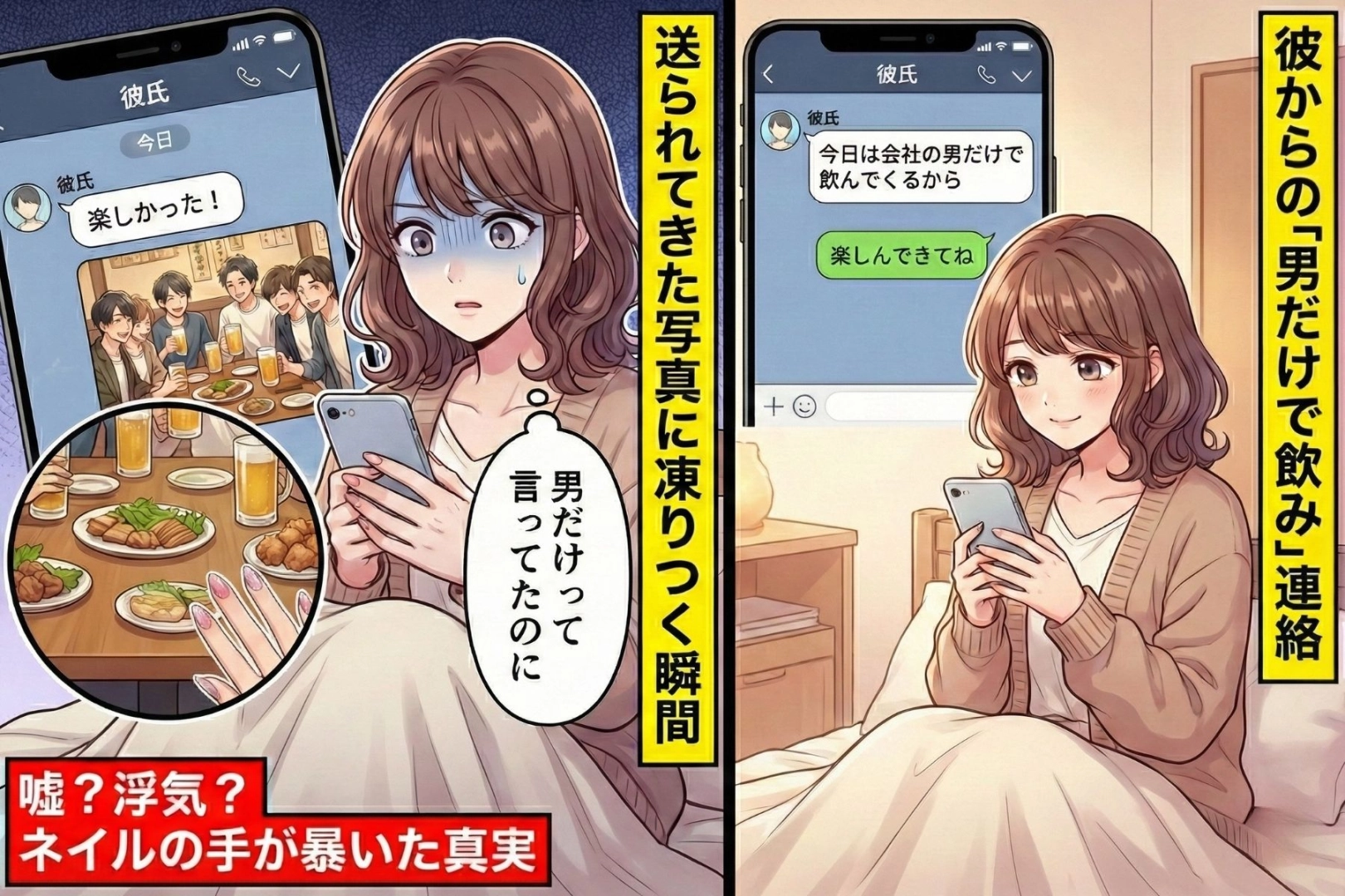 「男だけの飲み会だから」という言葉を信じていた私に届いた、一枚の集合写真。何気なく眺めていた画面の端に、あろうことか「見覚えのないネイル」が映り込んでいました…。