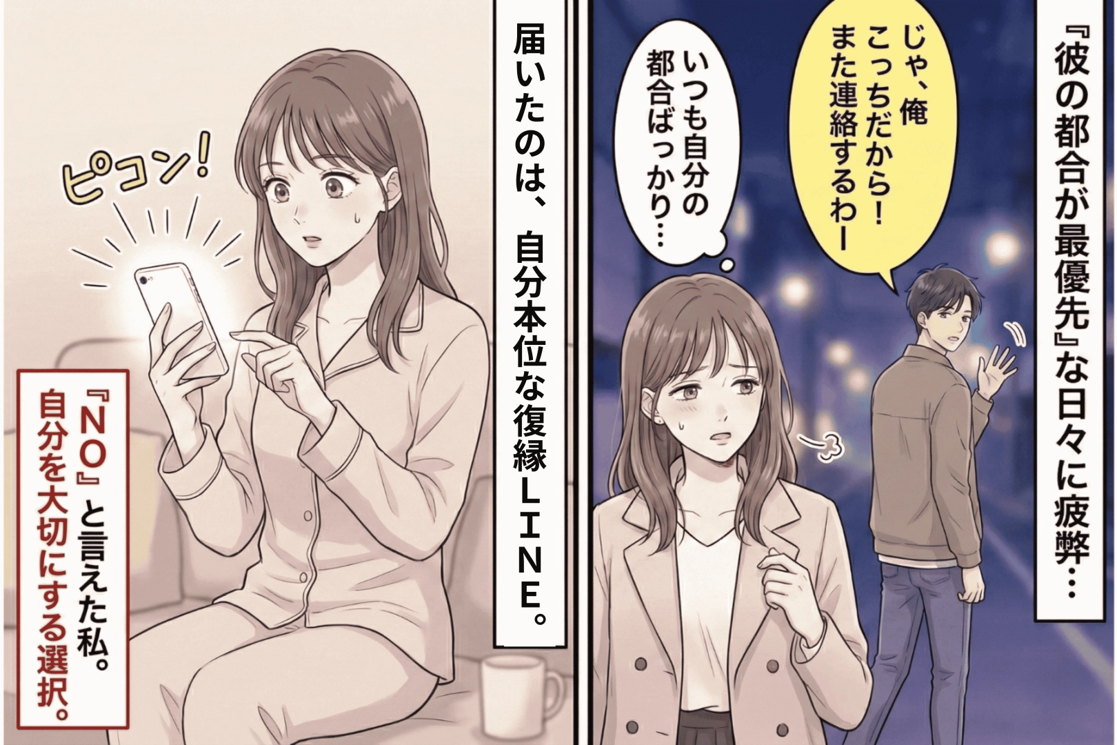 デートの約束は彼の都合で決まり、私の予定は後回し。仕事が忙しいと言われれば会えない日が続き、かと思えば急に「今から会える?」と連絡が来る。そんなことの繰り返しでした。私が体調を崩したときも「大変だね」の一言だけで、心配して会いに来てくれることはありませんでした。