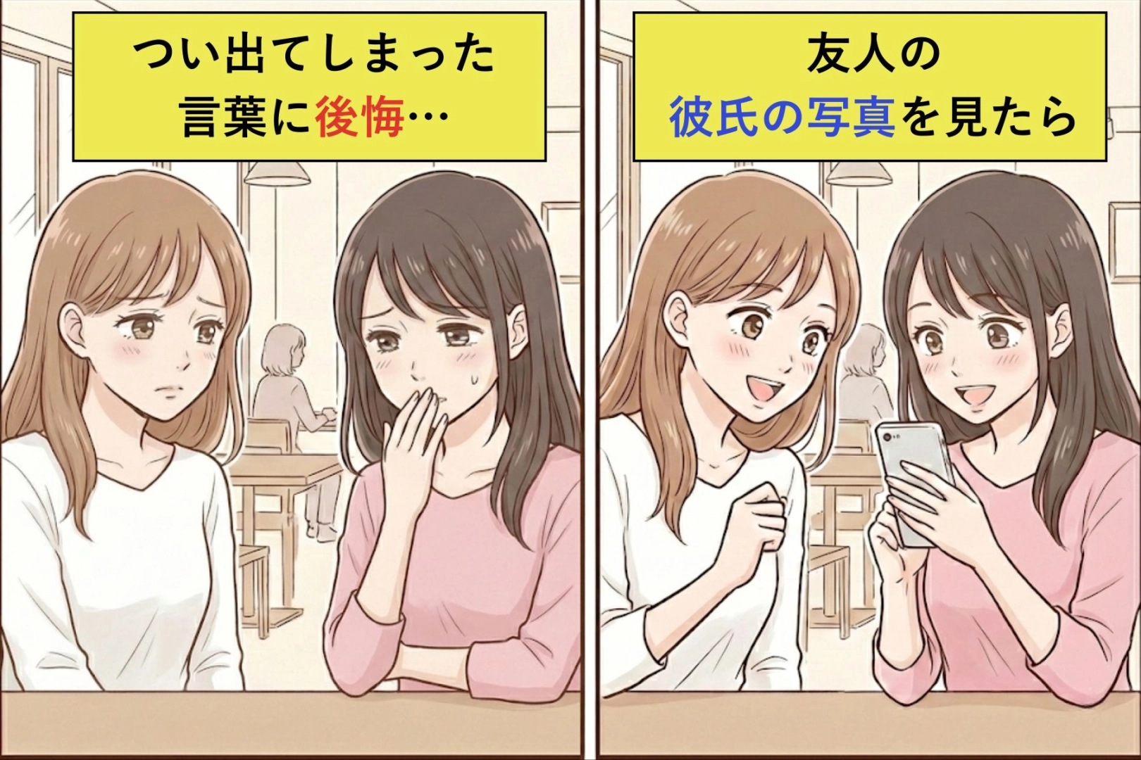 久しぶりに会った友人が、彼氏ができたと嬉しそうに話していました。写真を見せてほしいとお願いしたのですが、私の反応が彼女を傷つけてしまったかもしれません。軽い気持ちで言った一言が、後悔に変わりました。