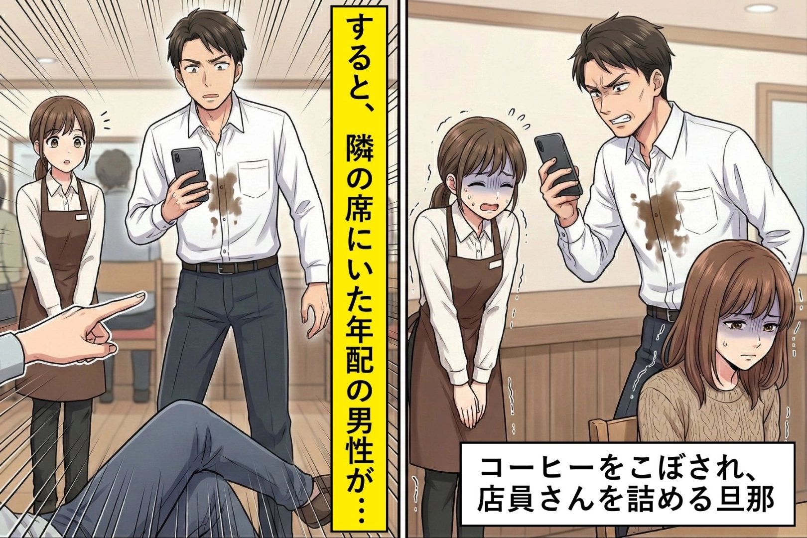 洋服にコーヒーをこぼされ「弁償でしょ?」と店員に詰める旦那→周囲の客の一言で立場が逆転した話