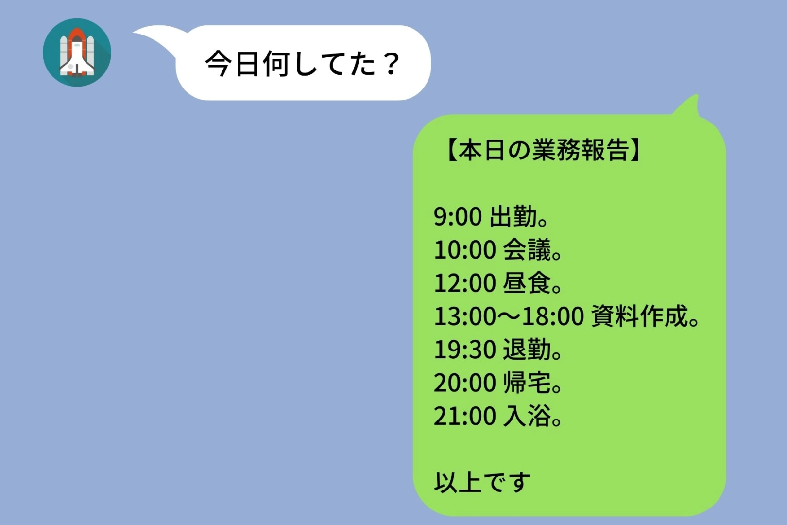 「【本日の業務報告】9:00 出勤。10:00 会議。12:00 昼食。13:00〜18:00 資料作成。19:30 退勤。20:00 帰宅。21:00 入浴。以上です」。送ってから、少し意地悪だったかなと思いました。でも、これが彼の求めている情報だと思い、私の1日の行動を、時系列で漏れなく送りました。
