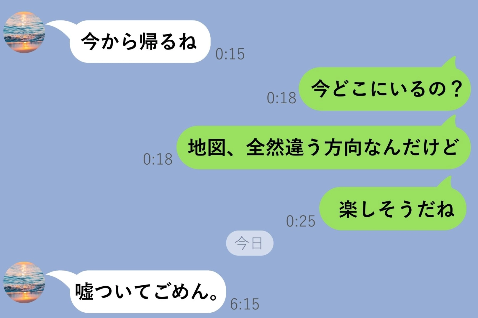 「今から帰る」のメッセージ後、位置情報を確認したら自宅と真逆の方向…→翌朝問い詰めたら…