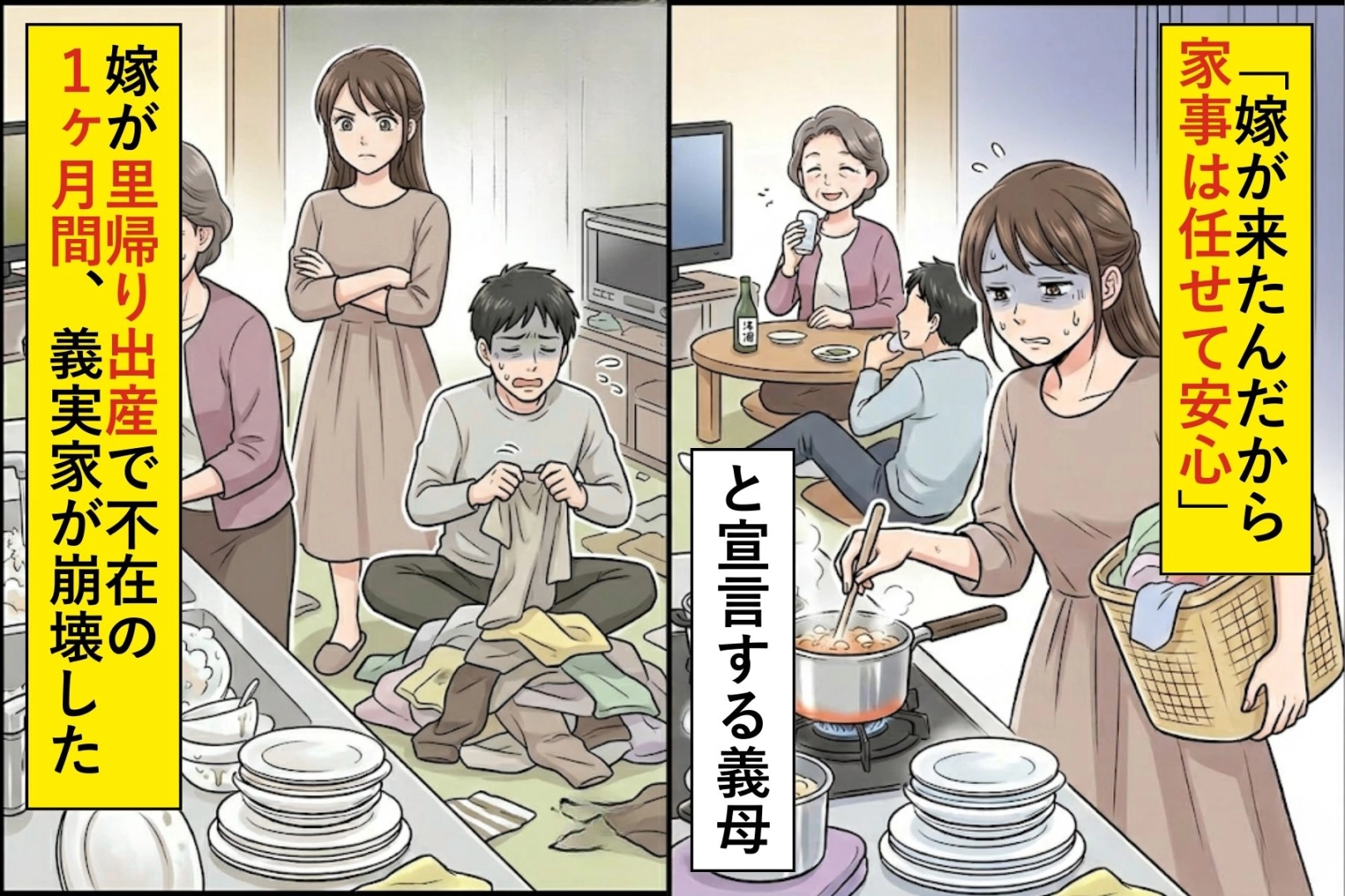「嫁が来たんだから家事は任せて安心」と宣言する義母→里帰り出産で嫁が不在の間、義実家が崩壊した