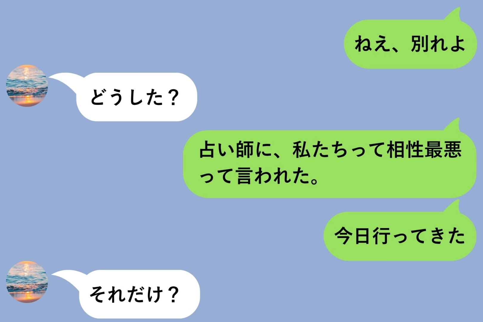 送信ボタンを押した瞬間、「しまった」と思いました。「ねえ、別れよ」——あの夜彼に送ったその言葉は、本当の意味での別れの宣告ではありませんでした。占い師に「相性最悪」と言われて、ただ不安を持て余したまま指が動いてしまっただけでした。でも翌朝、彼のメッセージ画面を開こうとしたら、アカウントが消えていました。