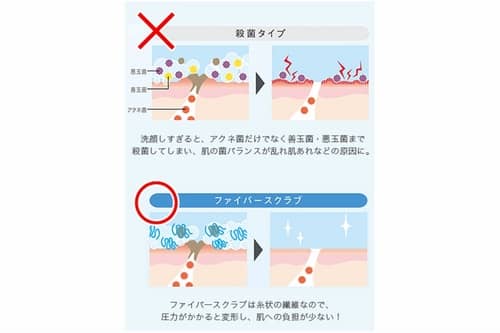 従来のスクラブ洗顔では、肌をゴシゴシと傷つけてしまう恐れがありましたが、ルナメアACのファイバーフォームは、糸状の植物繊維「ファイバースクラブ」でニキビの原因となる古い角質や毛穴つまりをやさしく絡め取るため、肌にかかる負担を軽減。