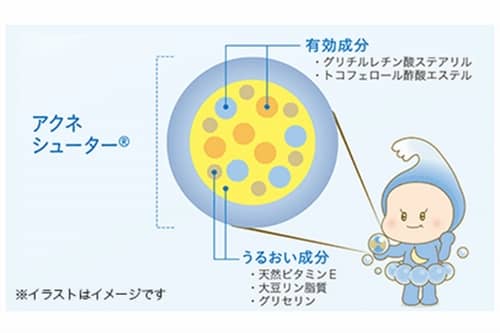 また、独自のナノ化技術によりつくられた「アクネシューター(R)」が、従来は浸透させづらかった「ニキビ予防有効成分」と「うるおい成分」をニキビの元へ直接届けて集中ケア!