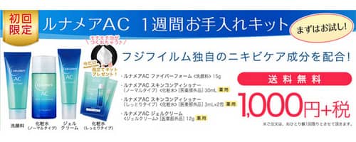 ルナメアACは、初回限定で基本の3点セット+スキンコンディショナー(しっとり)2包が¥1,000+税のトライアルキットでお得にお試しいただけます。