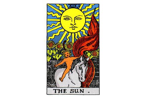 「ウ エイト版」と呼ばれるタロットカードの『太陽』は、22枚中19番にあたります。そのカードの絵柄には、輝かしい太陽の下で裸の子どもが無邪気に大きな旗 を振り、白馬にまたがっています。旗の色は赤く、生命の躍動が感じられます。後ろにはひまわりの花が咲き並び、よりいっそう明るさを増しています。