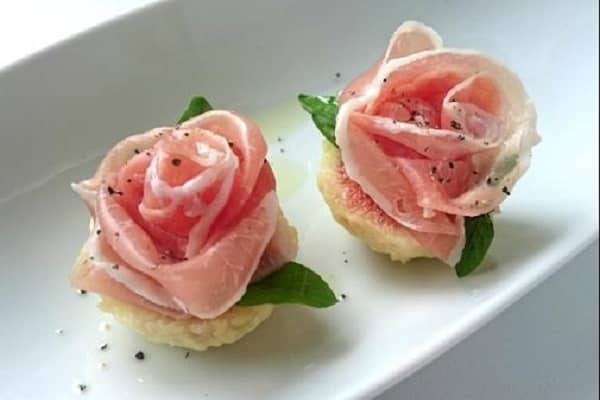 ② 生ハムは5枚×4組に切って、バラのように巻く。