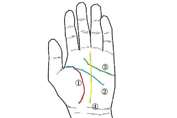 生命線は、図の1のように刻まれる線を言います。この線は内側に向かう程、強靱な体力を現し、外側に向かうほど、虚弱体質を現します。生命線は濃厚でくっきり刻まれるものほど体力が強いことを現し、逆に薄いものほど体力がないと判断するのが一般的。ただし、2の知能線が良い形状の場合、仮に生命線が短くても長寿の場合も。でも、途中で切れているような場合は、体調を壊したり怪我をしたりする暗示なので気をつけて。