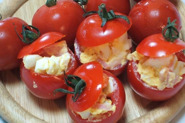 1.ミニトマトは上部を薄く切り、中をくり抜く。